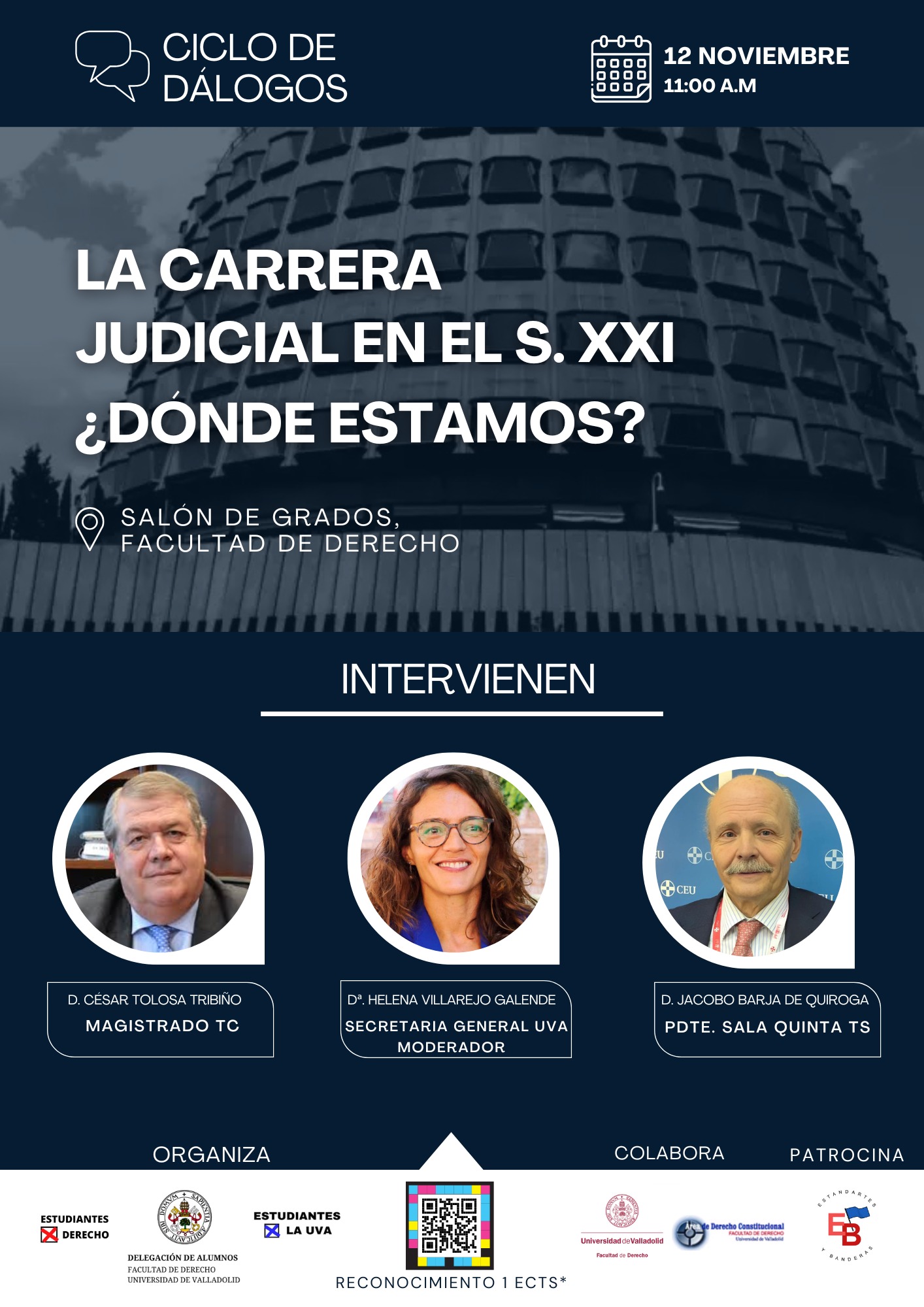 La Delegación de Alumnos de la Facultad de Derecho organiza el diálogo académico titulado “La carrera judicial en el siglo XXI: ¿Dónde estamos?”, que se celebra el miércoles 12 de noviembre, a las 11:00, en el Salón de Grados de la Facultad de Derecho de Valladolid.