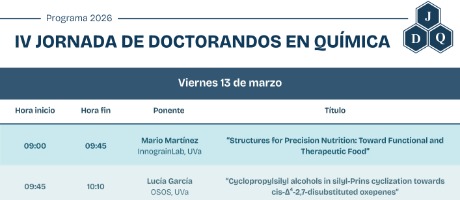 Jornadas para estudiantes de doctorado que deseen dar a conocer su trabajo investigador, organizadas por la RSEQ, Sección Castilla, incluyen exposiciones orales de estudiantes, así como sesiones de exposición de pósteres, ofreciendo un espacio para compartir resultados, generar discusión científica y fomentar colaboraciones. Y, al igual que todos los años, ¡Los estudiantes de máster sois más que bienvenidos a participar!