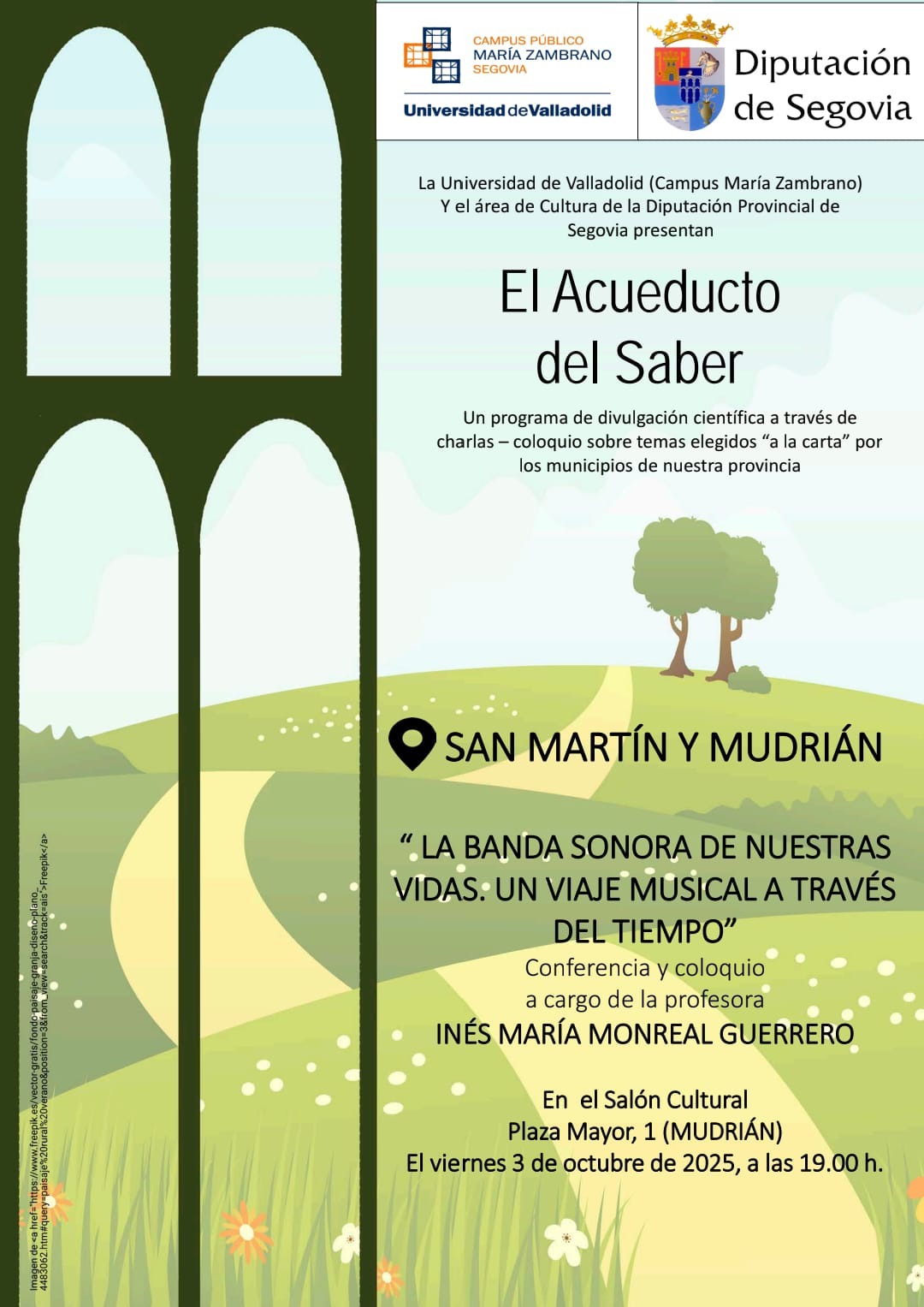 El viernes 3 de octubre a las 19h de la tarde, la profesora Inés Monreal, del Departamento de Didáctica de la Expresión Musical, Plástica y Corporal de la Facultad de Educación de Segovia, ofrecerá una conferencia titulada La banda sonora de nuestras vidas: un viaje musical a través del tiempo.