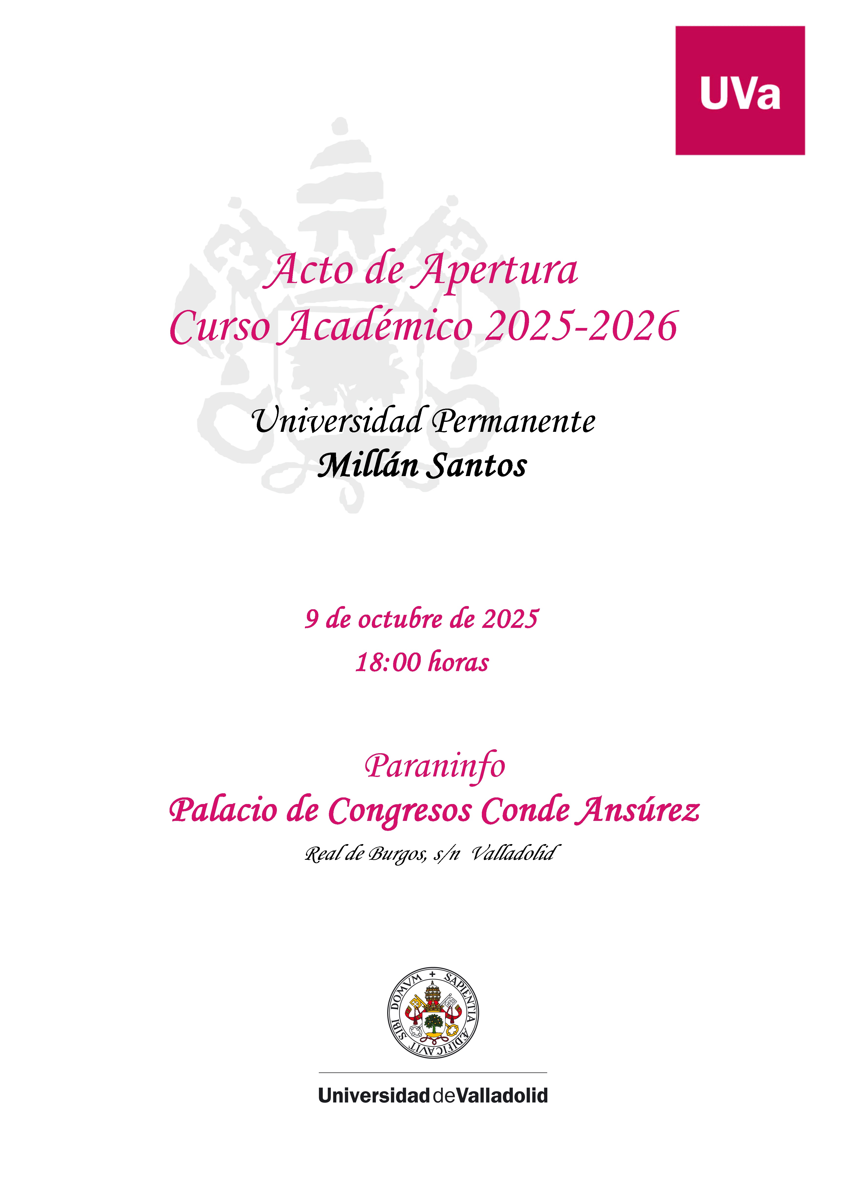 Fin: Jueves, 09 octubre 20:00 - Palacio de Congresos Conde Ansúrez (UVa), Calle Real de Burgos, Valladolid, España Paraninfo