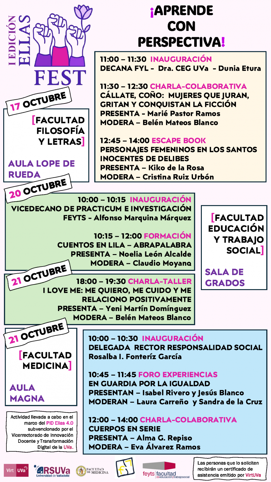• La Universidad de Valladolid presenta Ellas Fest, una cita académica y cultural que convierte las aulas en espacios de reflexión, debate y acción. Enmarcado en el Proyecto de Innovación Docente Ellas 4.0, este festival reúne a especialistas, estudiantes y docentes para visibilizar el papel de las mujeres en la cultura, la salud, el deporte y la educación.