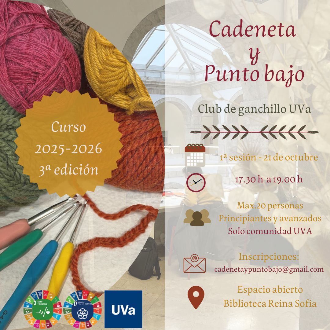 "Cadeneta y punto bajo" es el club de ganchillo de la UVa donde se reunen distintas personas (PDI, estudiantes y PTGAS) un día al mes, en el Espacio Abierto de la Biblioteca Reina Sofía. Unas aprenden y otras practican.