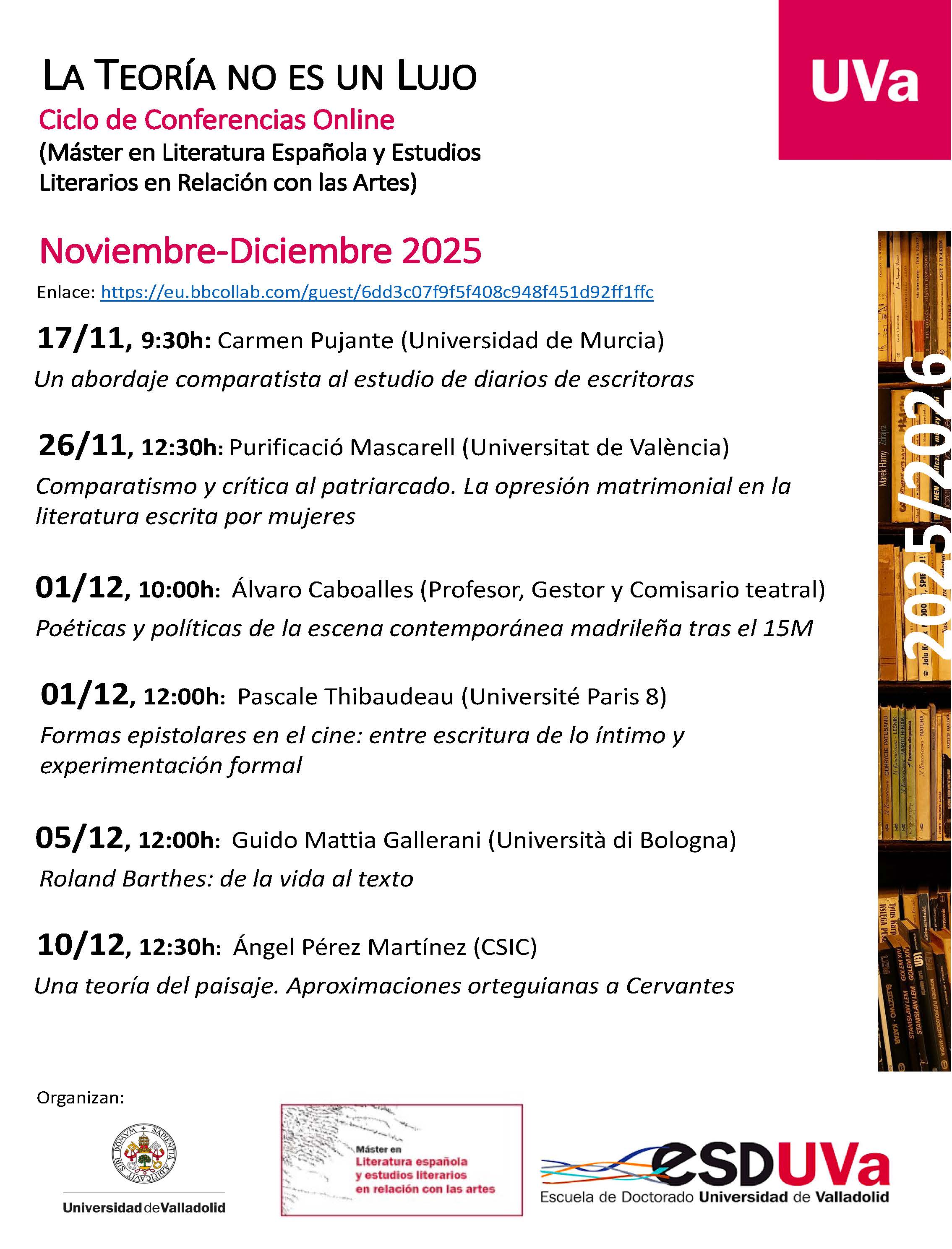 La Escuela de Doctorado de la Universidad de Valladolid, a través del Máster en Literatura Española y Estudios Literarios en Relación con las Artes, organiza el ciclo de conferencias online La teoría no es un lujo, que tendrá lugar del 17 de noviembre al 10 de diciembre de 2025.