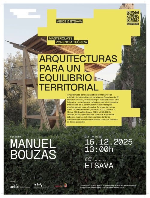 13:00 h: Masterclass: Manuel Bouzas: «Arquitecturas para un equilibrio territorial» Impartida por el arquitecto Manuel Bouzas, referente internacional, Premio Princesa de Girona 2025, profesor en la Universidad de Cornell y comisario del Pabellón de España en la 19ª Bienal de Arquitectura de Venecia 2025.