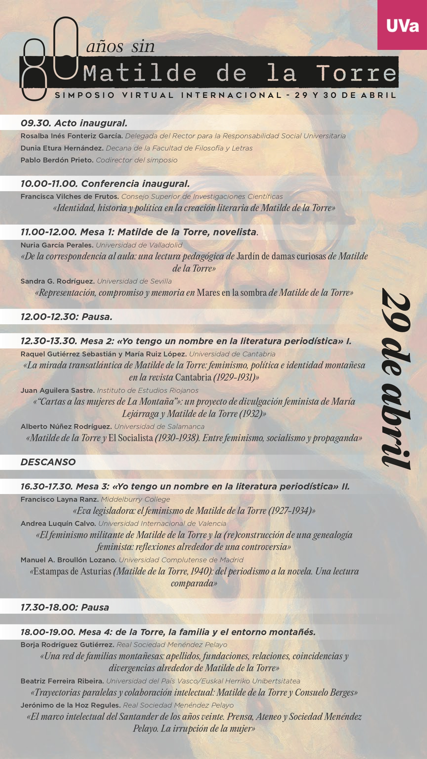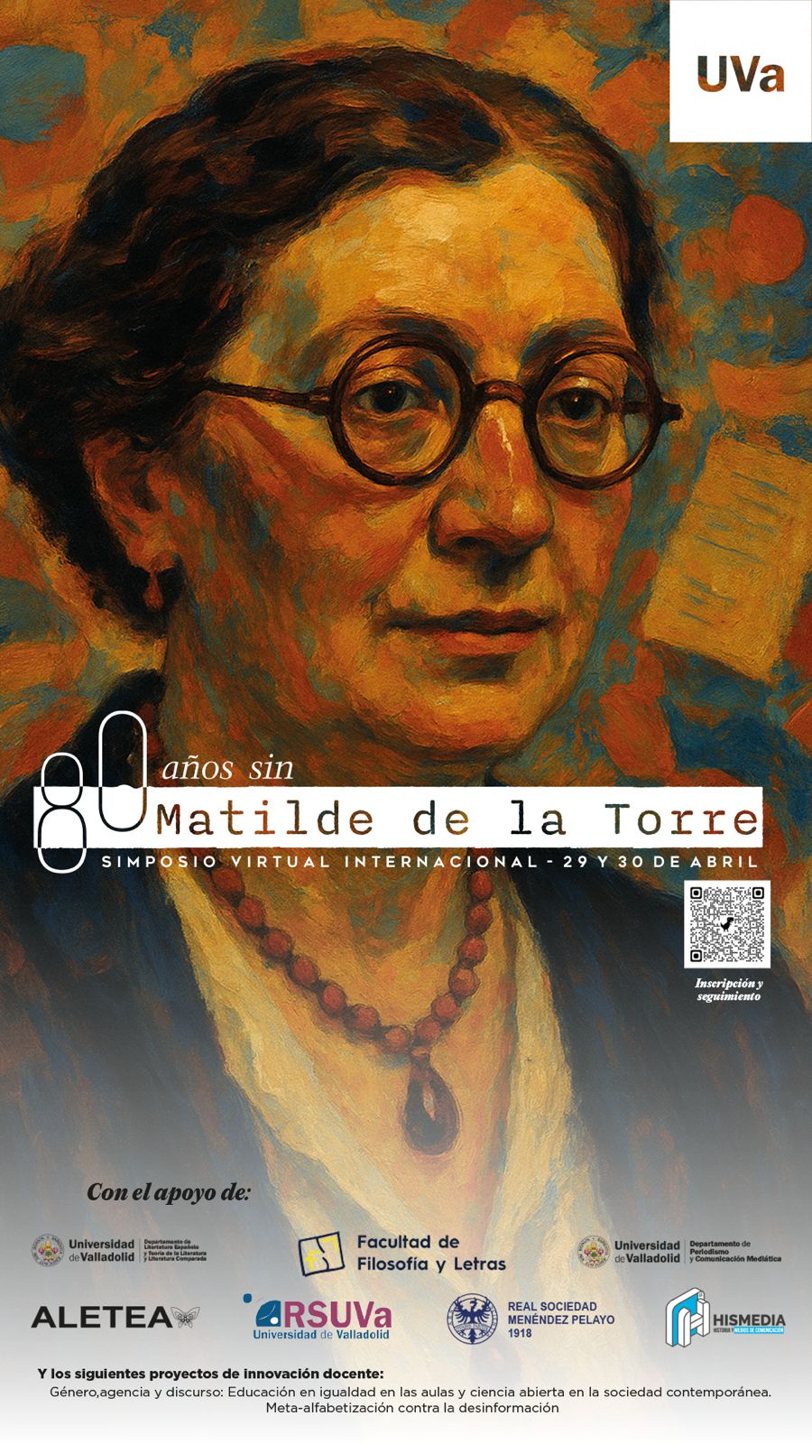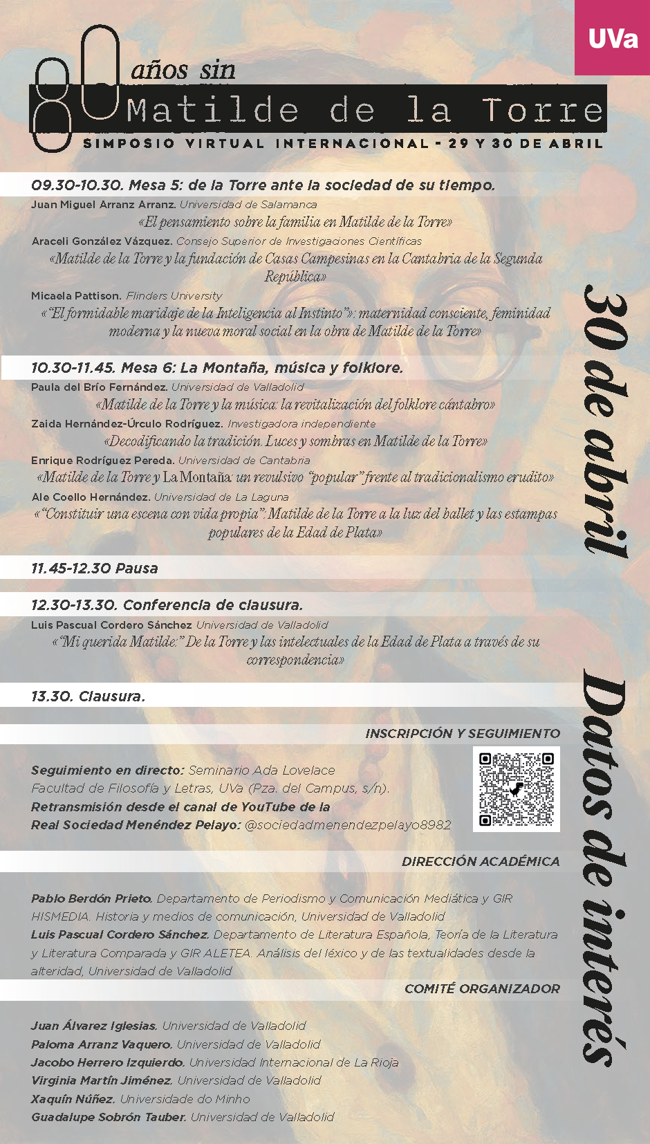 Este 2026 se conmemora el 80º aniversario del deceso de la diputada, folklorista y escritora Matilde de la Torre, cuyos restos acaban de ser repatriados desde México. Los Departamentos de Literatura Española y Periodismo de la Universidad de Valladolid, con motivo de esta efeméride, organizan el Simposio Virtual Internacional “Ochenta años sin Matilde de la Torre”, con dirección académica de los profesores Pablo Berdón Prieto y Luis Pascual Cordero Sánchez. Se celebrará en modalidad virtual los días 29 y 30 de abril, coincidiendo con las vísperas de la publicación de su último y póstumo artículo, “La era atómica”.